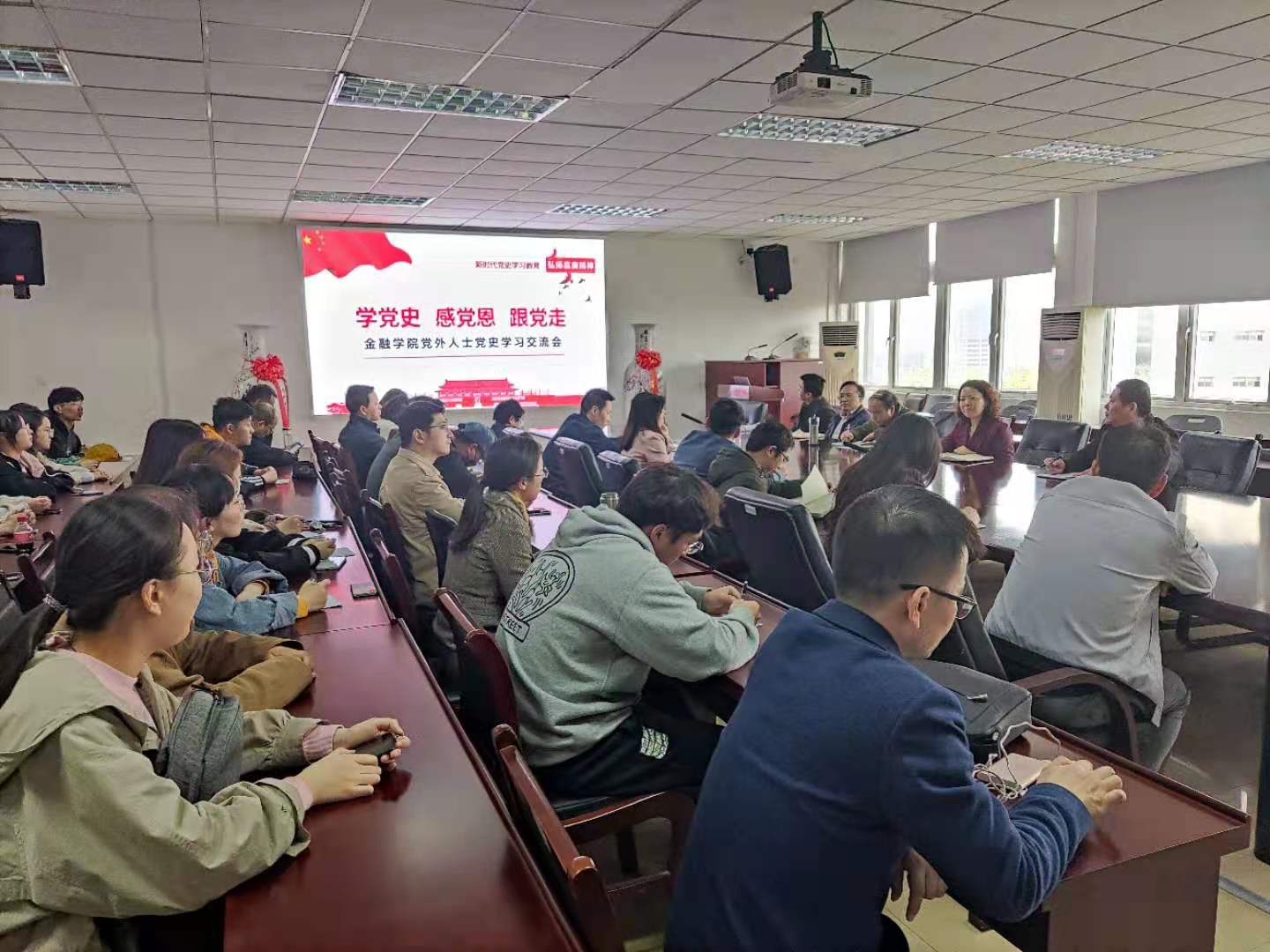 欲知大道,必先为史,参会的党外人士就自身学习党史的心路历程侃侃而谈。民主党派青年教师代表王慧老师就自身学习《论中国共产党历史》《中国共产党统一战线工作条例》的心得发言,并结合教学实际总结了深入开展理想信念教育、构建课程思政教学的思路,表示要做好新时代的新担当,向社会各界展现良好精神面貌,承担更多社会责任,做好社会服务,做社会主义核心价值观的自觉践行者;孙光林老师就金融党史进行了交流,为革命战争时期的红色金融岁月而折服,为党领导下的金融事业始终坚持自身底色、与红色政权同色而由衷赞叹;陈晓慧老师认为大学师者应该积极践行“传道受业解惑”的社会责任,将个人的奋斗融入到学校发展乃至国家发展的进程中,以建设者的高度来认真对待发展进程中的知识学习和思想提升。