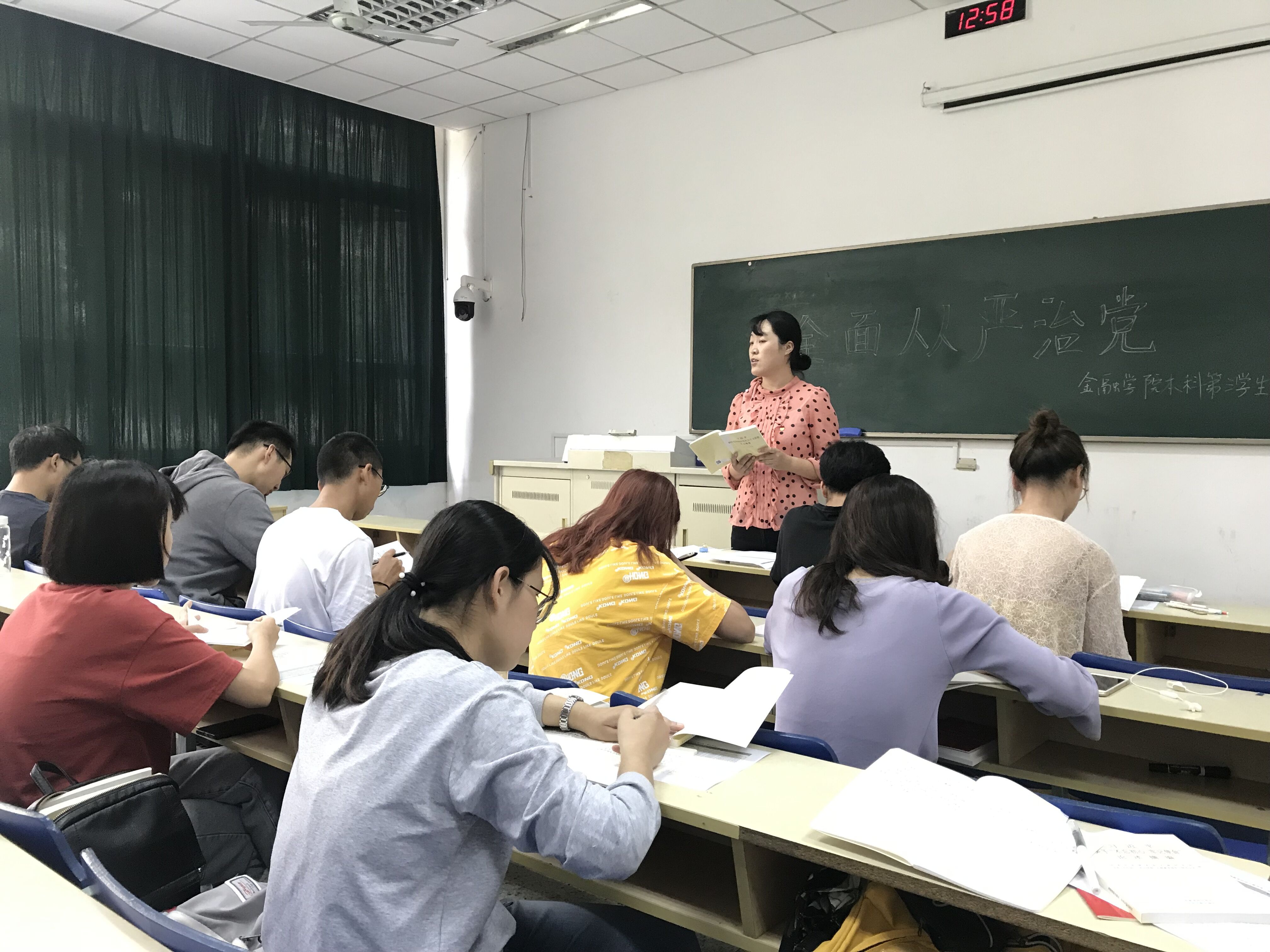 最后,全体学生党员书写了学习心得,意识到全面从严治党的工作重要性,更加深刻的认识到中国特色社会主义进入新时代,我们党一定要有新气象新作为。党要团结带领人民进行伟大斗争、推进伟大事业、实现伟大梦想,必须毫不动摇坚持和完善党的领导,毫不动摇把党建设得更加坚强有力。