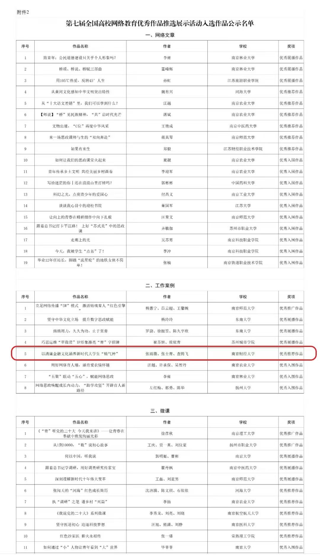 金融2103班刘怿同学的网文作品《张从军:三尺讲台传拓扑,九重教诲育芳华》获得第七届“大学生网络文化节”优秀入围作品。张雨薇、张士青和查腾飞老师合作撰写的网络思政工作案例《以清廉金融文化涵养新时代大学生“精气神”》入选全国高校网络教育优秀作品推选展示活动优秀推荐作品。本案例是成人片 思想政治教育工作案例首次获得该项荣誉。