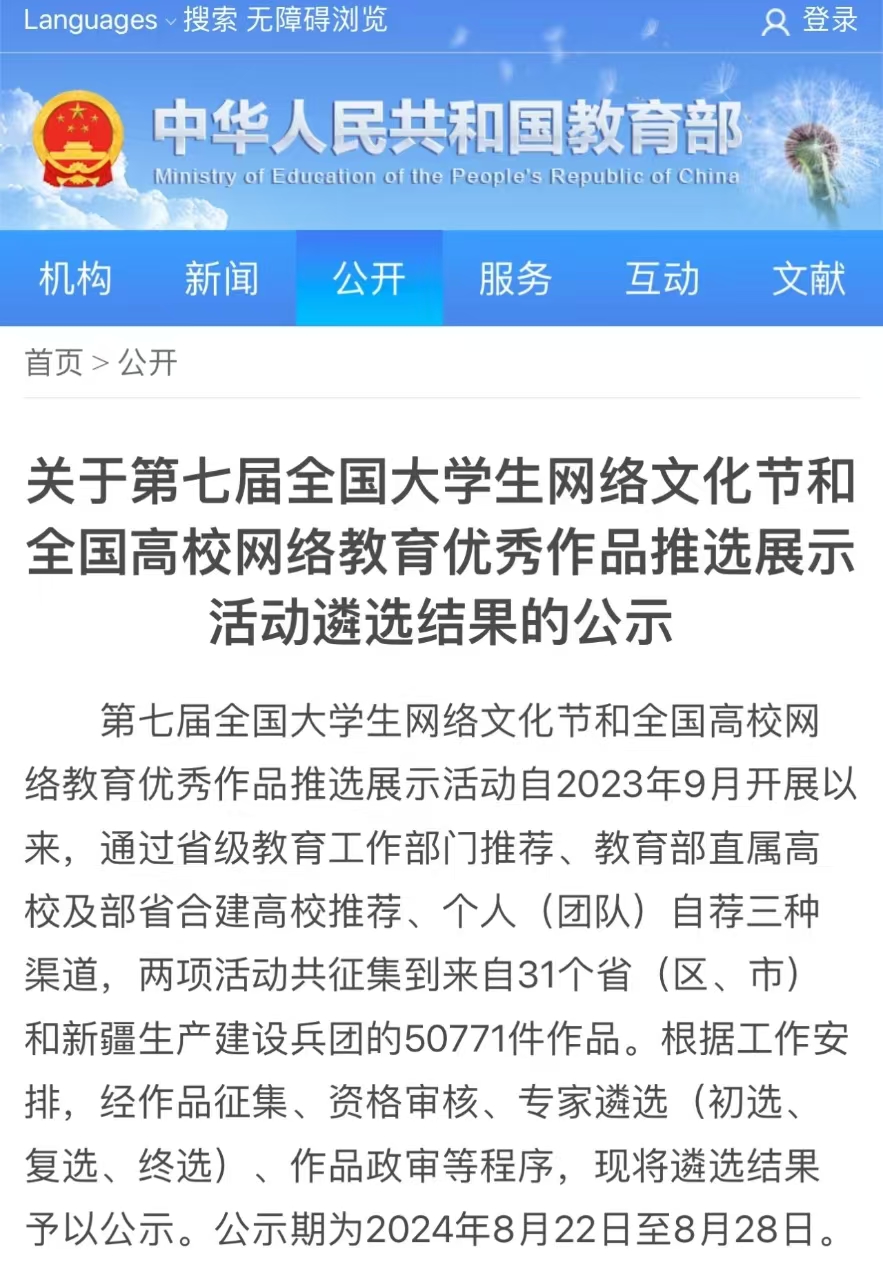 近日,由教育部思想政治工作司和中央网信办网络社会工作局主办的第七届“全国大学生网络文化节”和“全国高校网络教育优秀作品推选展示活动”遴选结果公布。经作品征集、资格审核、专家遴选(初选、复选、终选)、作品政审及教育部官网公示等程序,成人片 两项作品在第七届“大学生网络文化节”和“全国高校网络教育优秀作品推选展示活动”中获奖。