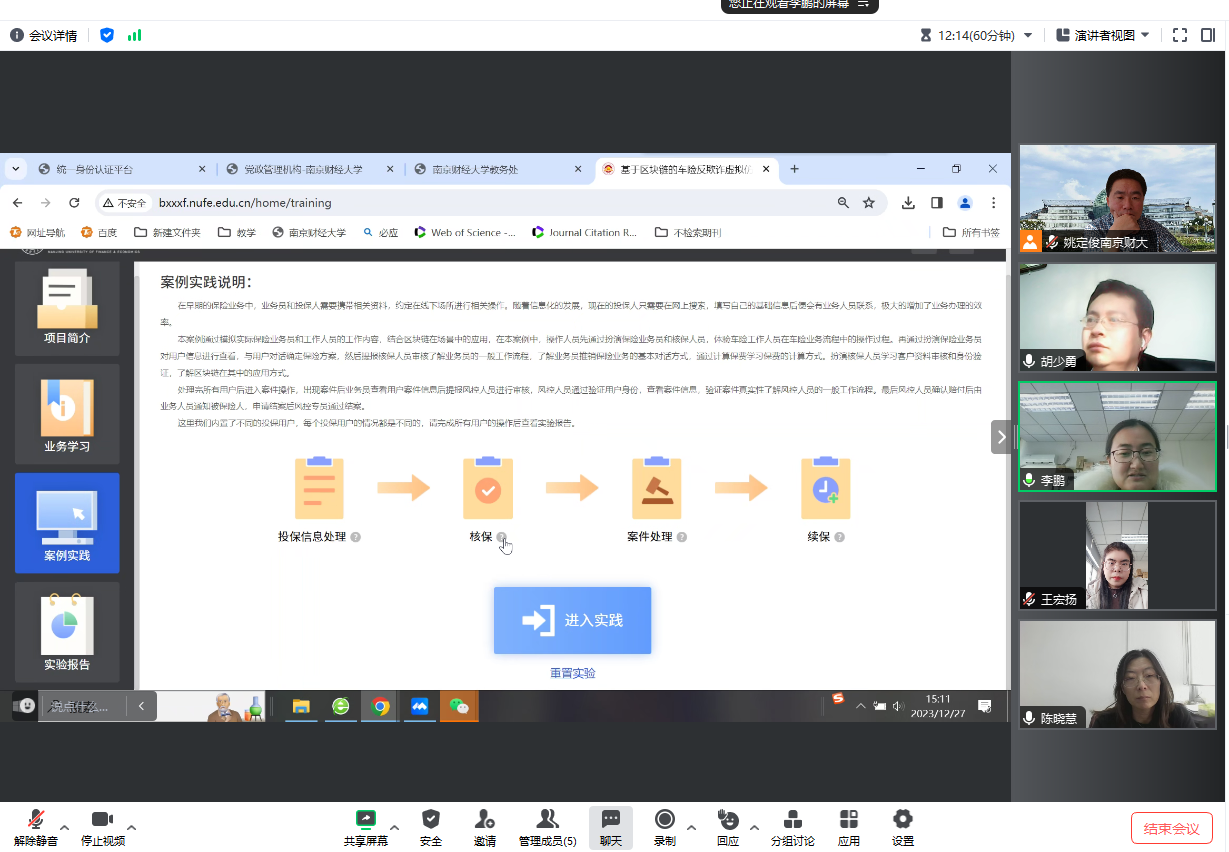 2023年12月27日下午15:00点,成人片 邀请了虚拟仿真实验教学专家、江西财经大学教务处副处长胡少勇教授,通过线上会议对成人片 《基于区块链的车险反欺诈虚拟仿真系统》国家一流课程开展申报辅导。会议由副院长姚定俊教授主持,成人片 教学副院长陈晓慧、保险系教师李鹏、王宏扬参加了本次辅导会。