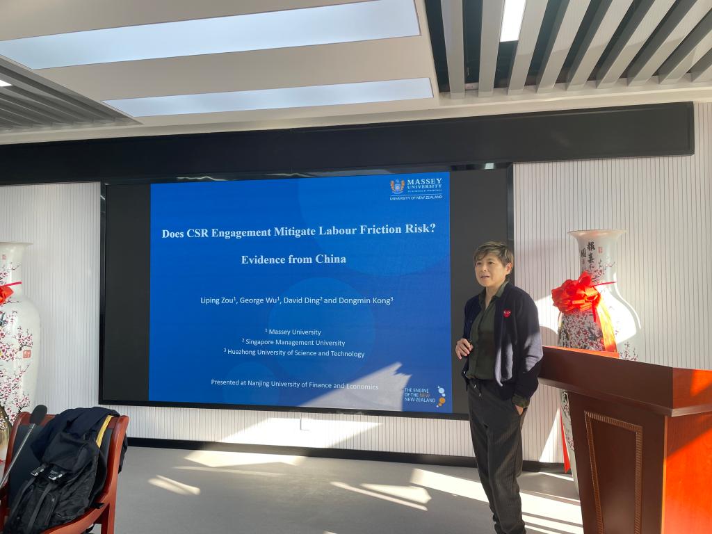11月6日下午,应成人片 邀请,新西兰梅西大学商学院邹丽萍教授在仙林校区德经楼508会议室作了题为“Does CSR Engagement Mitigate Labor Friction Risk? China Evidence”的学术报告。学院副院长姚定俊教授和青年师生聆听了报告,报告由成人片 副院长尹雷主持。