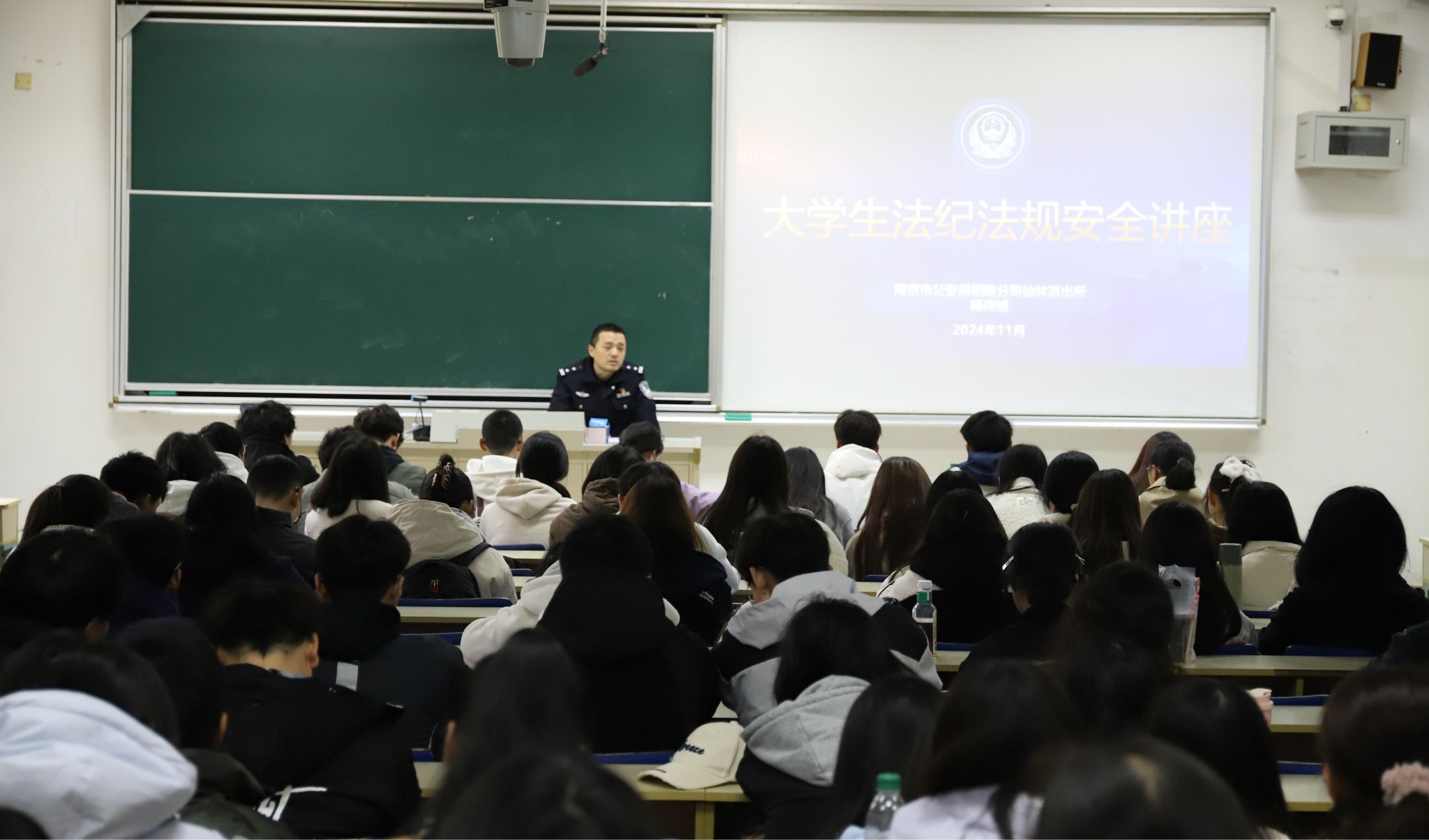 11月19日下午,在德济楼103教室,成人片 特邀南京市公安局栖霞分局仙林派出所副所长杨传旭警官,举办了一场以“大学生安全”为核心的精彩讲座。本次讲座由成人片 党委副书记张士青主持。