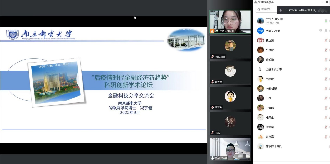 9月16日晚,成人片 举办“后疫情时代金融科技的发展”线上分享会,会议邀请了南京邮电大学冯宇健、南京航空航天大学虞建两位博士做专题讲座。两位博士阐述了当前计算机技术在金融领域的应用情况,分析了利用计算机技术推动后疫情时代下金融发展的可能性,为同学们的研究方向提供了新的思路。