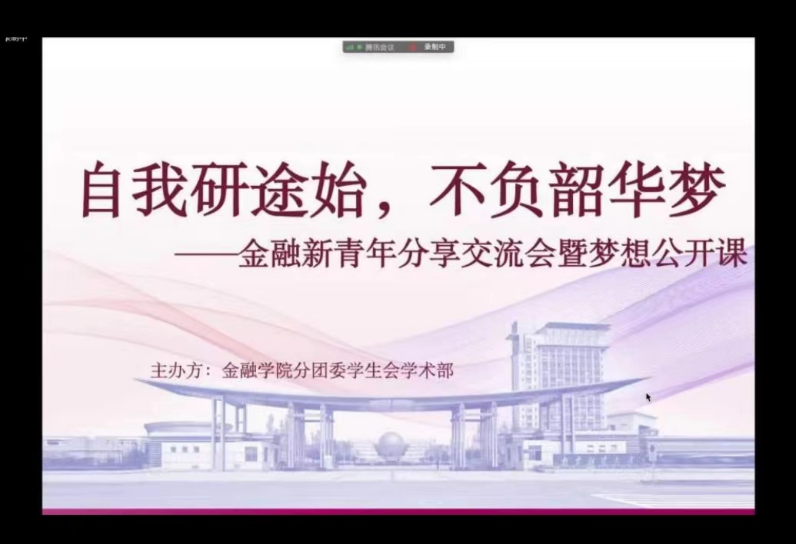 时入五月,又将是一年考研季。为解答同学们对于考研的迷惘与困惑、分享上岸学长学姐的成功经验,5月15日下午5点,成人片 在线上举办自我研途始,不负韶华梦——金融新青年分享交流会暨梦想公开课。姜耀、孙鼎立、钱思彤、王子净等四位优秀学长学姐应邀出席,部分大一大二大三的同学参加了此次活动。