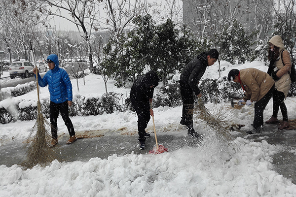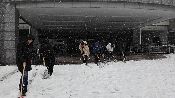 午时,学生党员们手持大扫帚,铁掀等卫生工具一起来到了教学楼门口。此时积雪已达10厘米,严重影响了广大师生的出行。虽然寒风凛冽,但党员的劳动热情依旧不减,他们分工合作,互帮互助,不畏困难。但原有卫生工具扫雪效率较低,为了加快速度,他们更是搬来了一块大展板,高喊口号,共同推进。经过半个小时的辛苦劳动,终于顺利的为老师同学们清理出一条安全畅通的道路,减轻了环卫工人的工作量,并及时降低了校园安全隐患。
