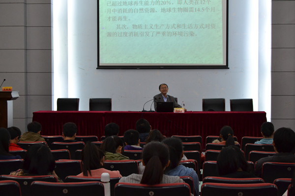 讲座中,胡连生教授首先向同学们介绍了20世纪90年代以前,资本主义所奉行的以大量生产、大量消费、大量废弃为主要表现的物质主义,指出物质主义在使社会生产力达到历史高度、物质文明飞跃进步的同时,也带来了资源危机,环境污染,生活环境严重下降等灾难性的后果。