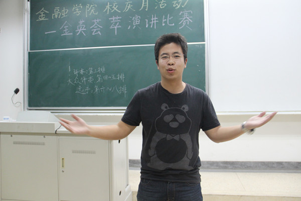 2013年11月8日18点30分,成人片 校庆月活动“金英荟萃”之英语演讲比赛在专三101拉开帷幕。来自大一的八位同学和大二的十位同学参加了此次比赛。Yunlan Zhu老师、知行学社副社长景玲玲、院辩队队长卞媛、英语沙龙协会部长陆梦颖、邵雅茹以及金融俱乐部负责人黄泽凡组成专业的评委阵容。金融院各班学生代表作为大众评审参与了本次比赛。
