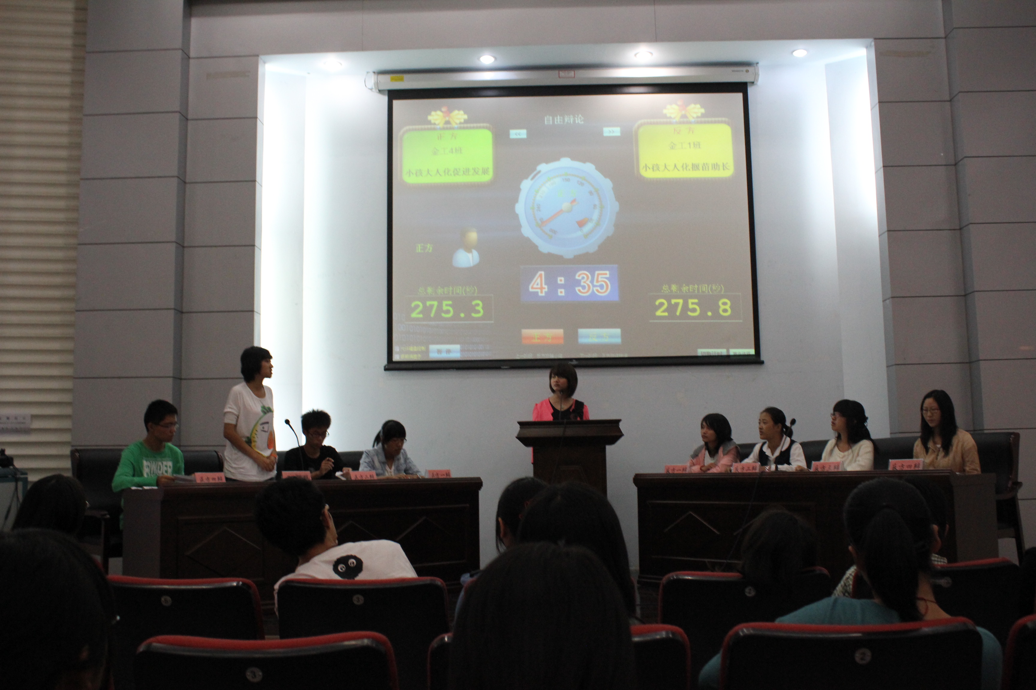 本轮比赛分为两场。第一场比赛的烽火由金工4班和金工1班点燃,正方的金工4班观点是小孩大人化能促进发展,而反方金工1班观点认为小孩大人化是揠苗助长。第二场由正方保险2班对阵反方保险1班,辩论双方就”奢侈品热是否为国人消费观念的进步“展开精彩的辩论。