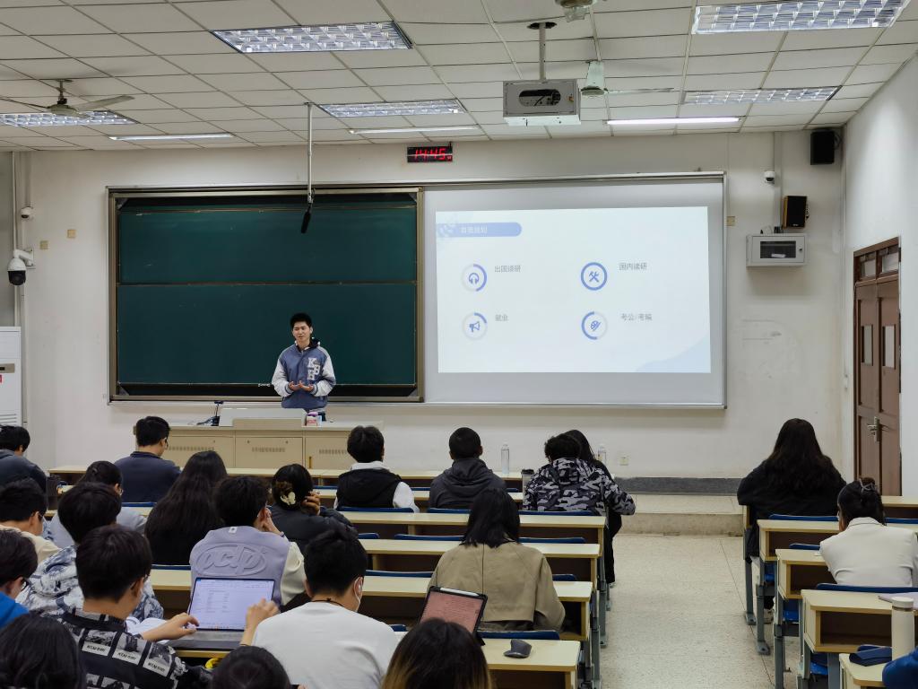 王彦嵩同学首先畅谈了择校南大的心路历程,然后深入剖析了学硕与专硕的区别,初试与复试的相对重要性,以及围绕考研、出国、就业、考公/考编的规划选择,最后重点结合自身经历强调了本科阶段努力尝试科学研究、撰写学术论文的重要意义,勉励学弟学妹充分发挥学习的主观能动性,积极开展研究性学习。