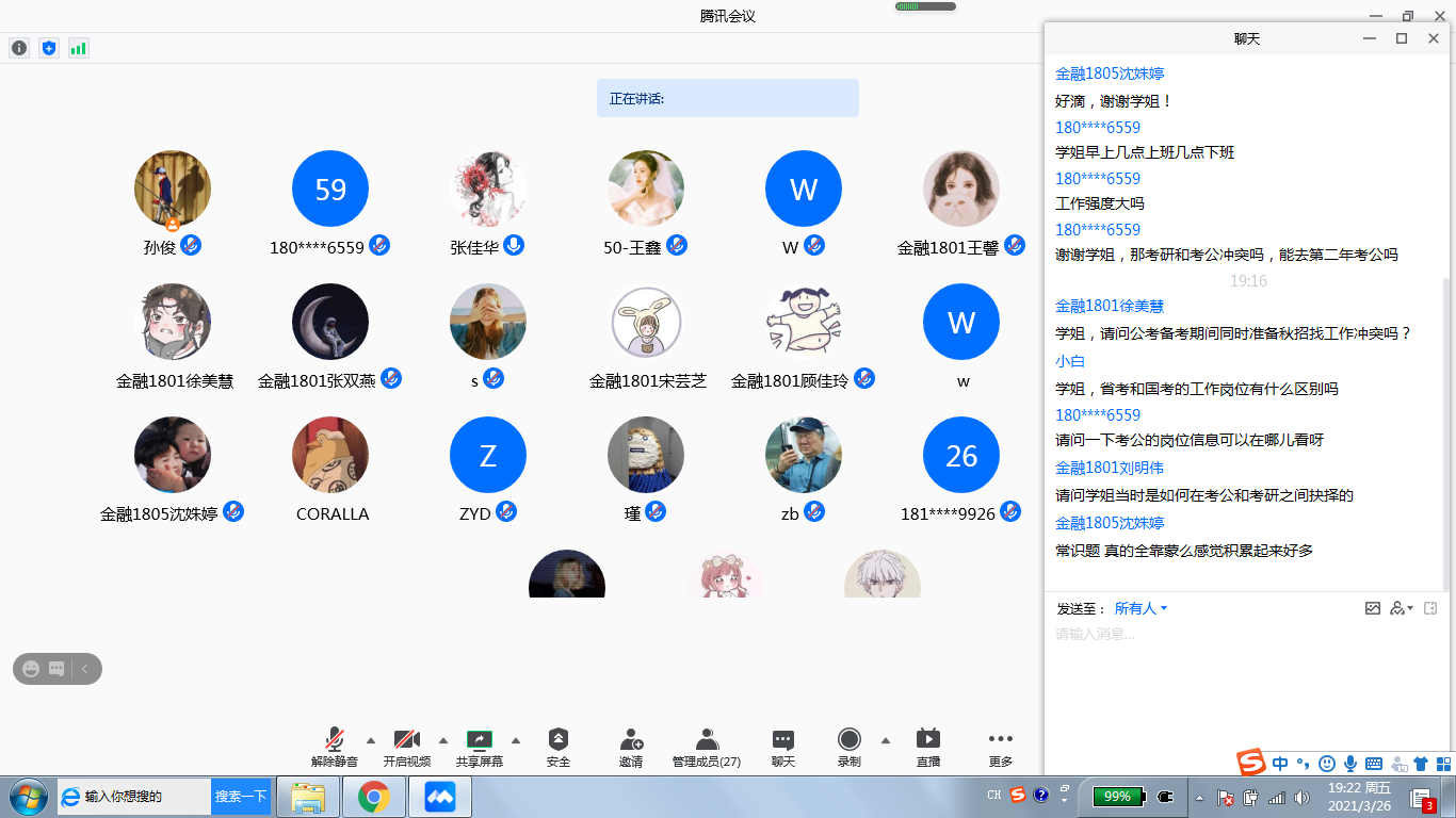 为帮助成人片 大三同学更全面了解求职就业信息,3月26日晚6点半,成人片 金融学系孙俊老师主持召开“商业银行、公务员招录专场线上求职经验分享会”。报告人分别为成人片 金融2016级校友张佳华,现就职于国家税务总局上海市徐汇区税务局;金融2016级校友王鑫,现就职于招商银行南京分行,春招还收到中信银行杭州分行、光大证券南京、招商证券上海等Offer。