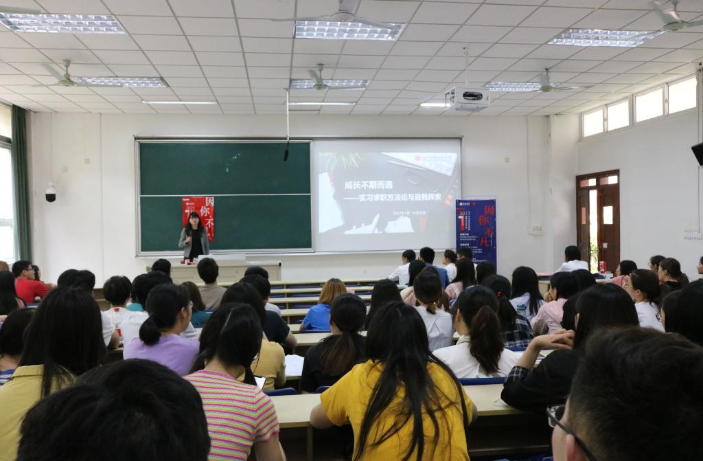 5月31日下午,成长不期而遇——《实习求职方法论与自我探索》就业指导讲座在德经楼114教室举行,中信证券江苏分公司人力资源总监王裕娟担任本次宣讲人,成人片 党委副书记章冬斌及部分2016级学生参加了本次招聘会。