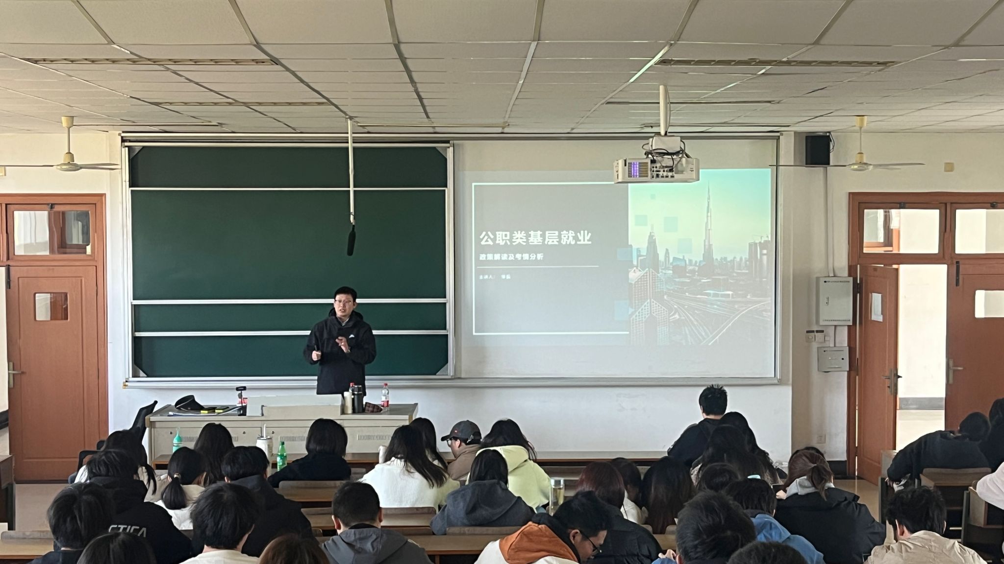 讲座伊始,邹振老师对公职类基层就业的招考流程进行了详尽阐释,涵盖了报名选岗、笔试、面试、体能测试、体检、政审等多个关键环节。他提醒学生,不同岗位的竞争差异较大,尤其是经济类、财会类、计算机类等专业的学生在公职类考试中具有显著优势。