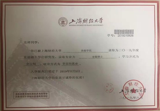 我的转专业之路比较坎坷,高考虽然有幸考取成人片 ,但是没有录取到自己最喜欢的专业,入学后又因0.02个基点之差转专业失败。幸运的是我始终没有放弃对金融专业的偏爱和执着,在见到学校金融二学历的招生简章后我毫不犹豫的报了名。我的初衷是想通过对金融知识的系统性学习,将来进入金融领域工作,或者报考金融类研究生。在大三下学期我开始为报考上海财经大学金融硕士做准备,我很快发现绝大部分专业知识都在二学历的课堂学习过。作为一名跨考生,虽然整个备考过程比较艰辛,但因为之前在二学历课堂上打下了牢固的专业课,少了很多其他跨考生的焦虑和不安。我最终在报考上海财经大学金融硕士的1600多名考生中胜出,以初试第23名,复试第7名,综合第13名的好成绩成功录取。