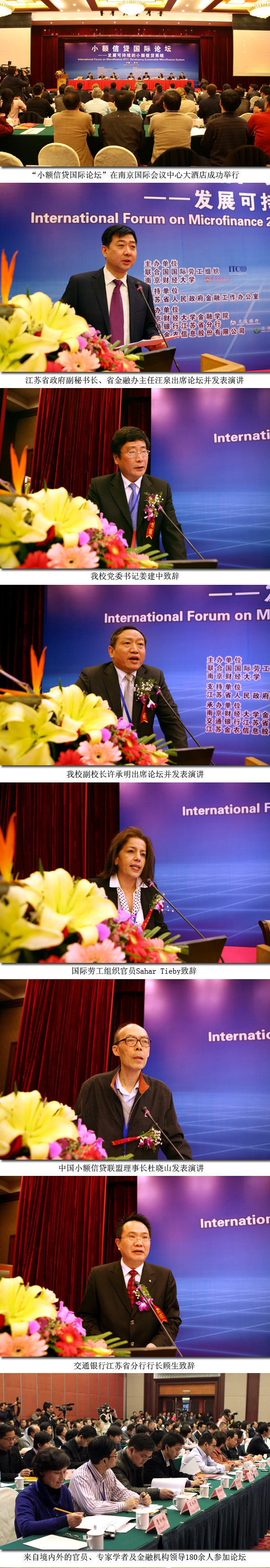 由联合国国际劳工组织(ILO)、成人片 联合主办,江苏省人民政府金融工作办公室支持,成人片 、交通银行江苏省分行、江苏金农信息股份公司联合承办的“小额信贷国际论坛”2011年3月19日—21日在南京国际会议大酒店成功举行,来自境内外的官员、专家学者及金融机构领导200多人参加论坛,围绕小额信贷利益相关者的合作关系和商业模式、发展可持续的小额信贷系统以减少贫困、营造有利于小额信贷增长的政策环境等议题展开研讨。全国人大财经委员会副主任委员、中国人民银行原副行长吴晓灵专门为论坛发来“对小额贷款公司发展前景的若干意见”的书面发言,江苏省政府副秘书长、省金融办主任汪泉,成人片 党委书记姜建中,副校长许承明,国际劳工组织官员Sahar Tieby、祖良荣,中国小额信贷联盟理事长杜晓山,交通银行江苏省分行行长顾生等出席论坛。